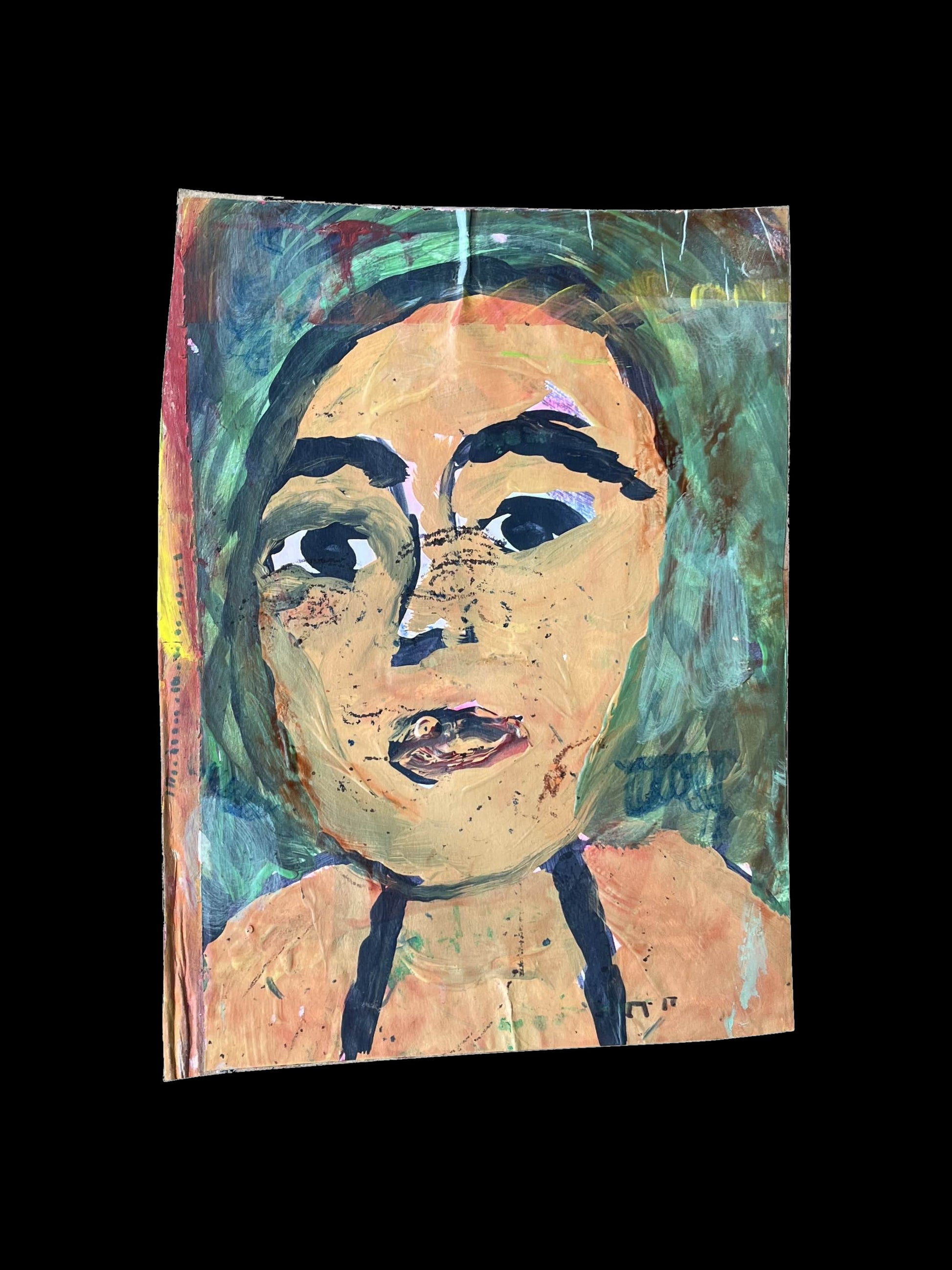 This bold acrylic portrait on textured cardboard captures a compelling gaze that feels both grounded and enigmatic. The artist uses earthy tones of green, brown, and peach, layered with expressive brushstrokes, to create a raw and authentic depiction of emotion. Subtle details, such as freckled features and intense eyes, invite viewers to connect with the subject’s inner story. The dynamic background, with its muted swirls of color, complements the portrait and enhances its depth. A striking, one-of-a-kind piece that brings character and warmth to any collection.