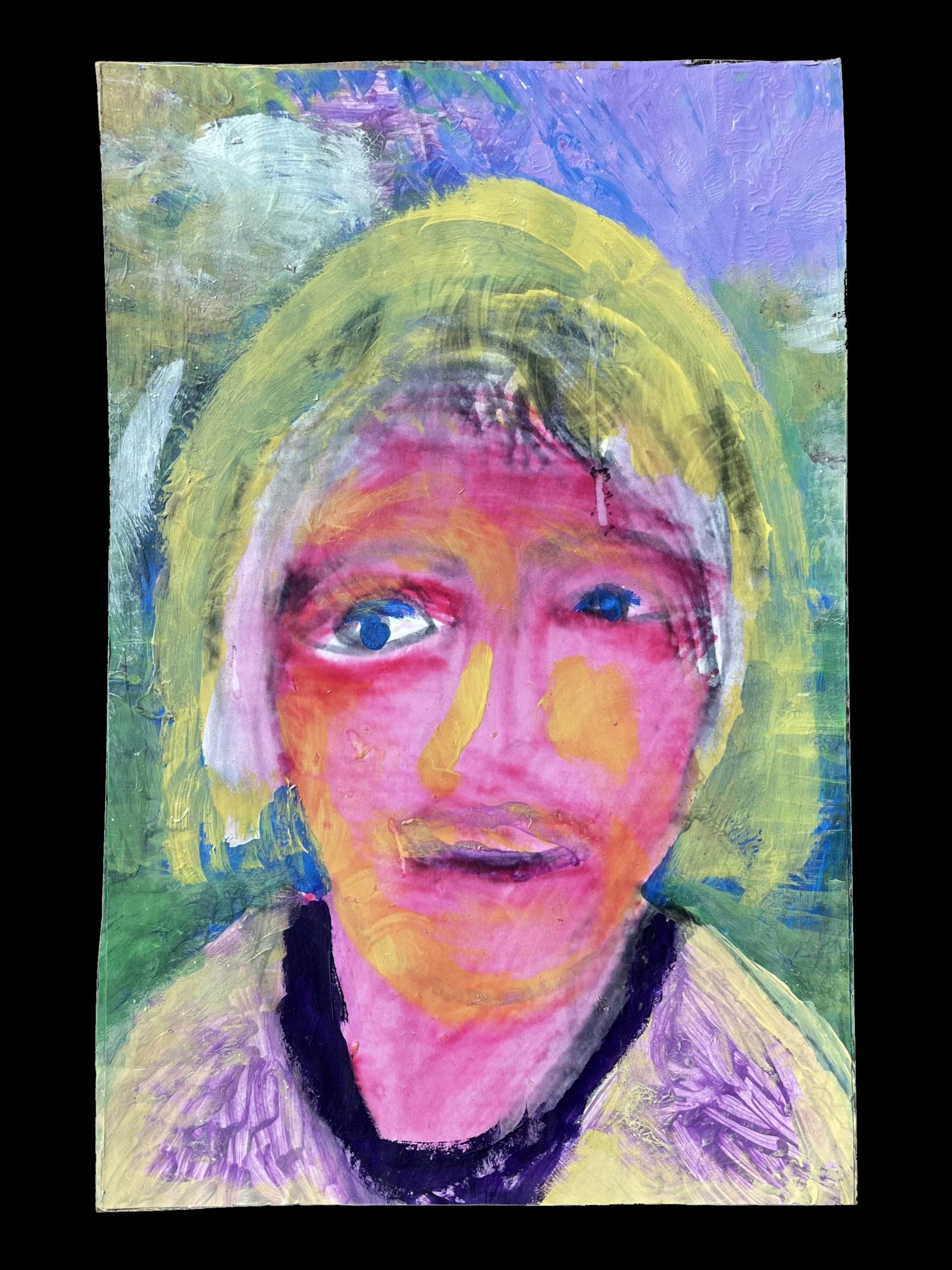 This radiant acrylic portrait on cardboard captures a figure bathed in luminous, shifting hues. The subject's vivid pinks and yellows blend into soft purples and greens, creating a striking contrast between the warmth of their presence and the cool serenity of the background. The delicate brushstrokes and layered textures evoke an ethereal, otherworldly quality, as if the figure exists in a fleeting moment of light and emotion. This artwork is an invitation to explore the transient beauty of color and human expression, showcasing Bobby's ability to fuse boldness with fragility.