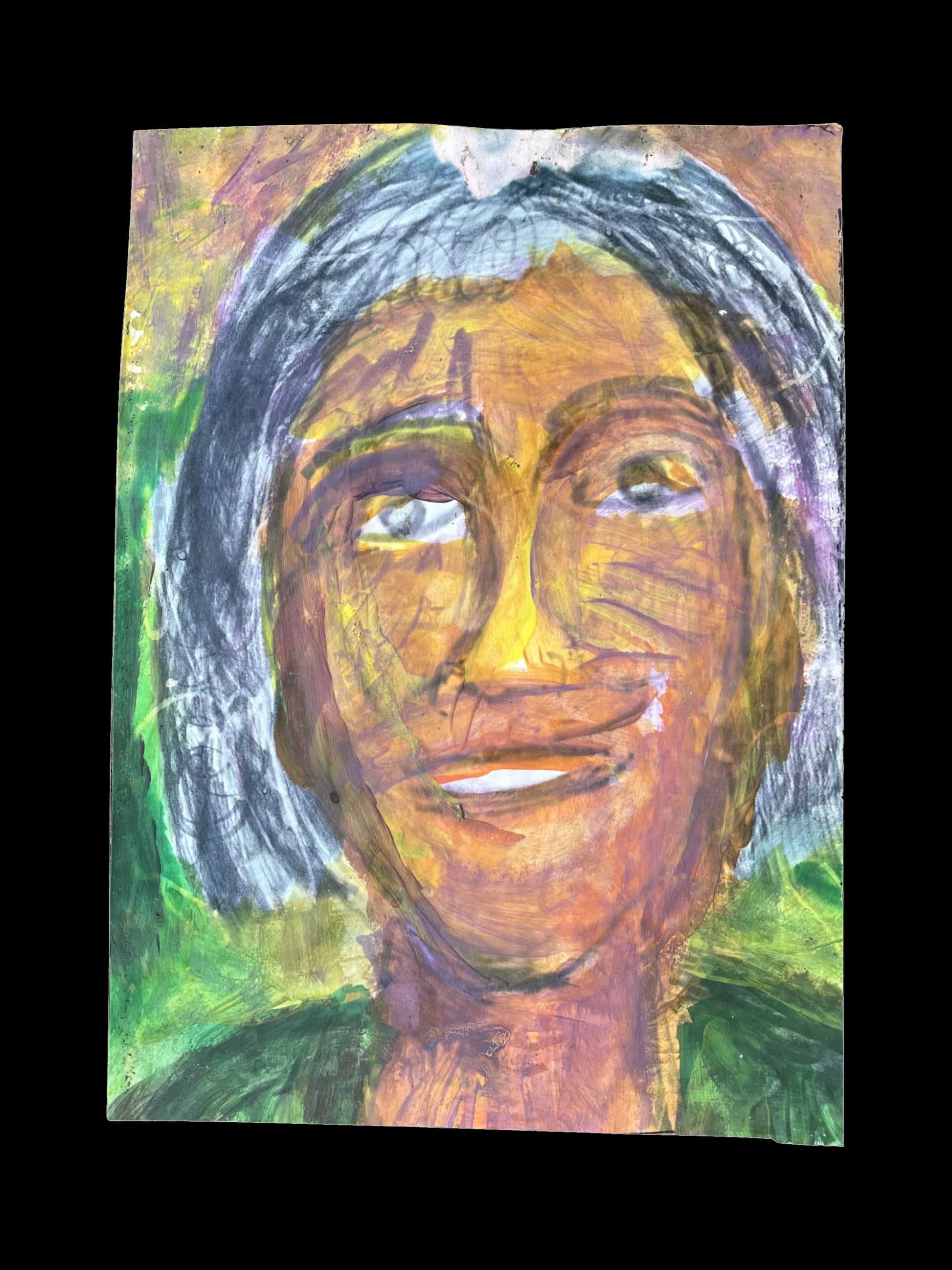 This radiant acrylic portrait, painted by Bobby on textured cardboard, exudes warmth and life. The subject’s serene expression and glowing golden tones are complemented by vibrant greens and purples, capturing a sense of harmony and joy. Bobby's expressive brushwork and layered textures give the artwork a tactile, immersive quality, inviting viewers to connect with its emotional depth. The interplay of light and color reflects Bobby’s unique ability to infuse energy and optimism into his work, making this a standout addition to any art collection.