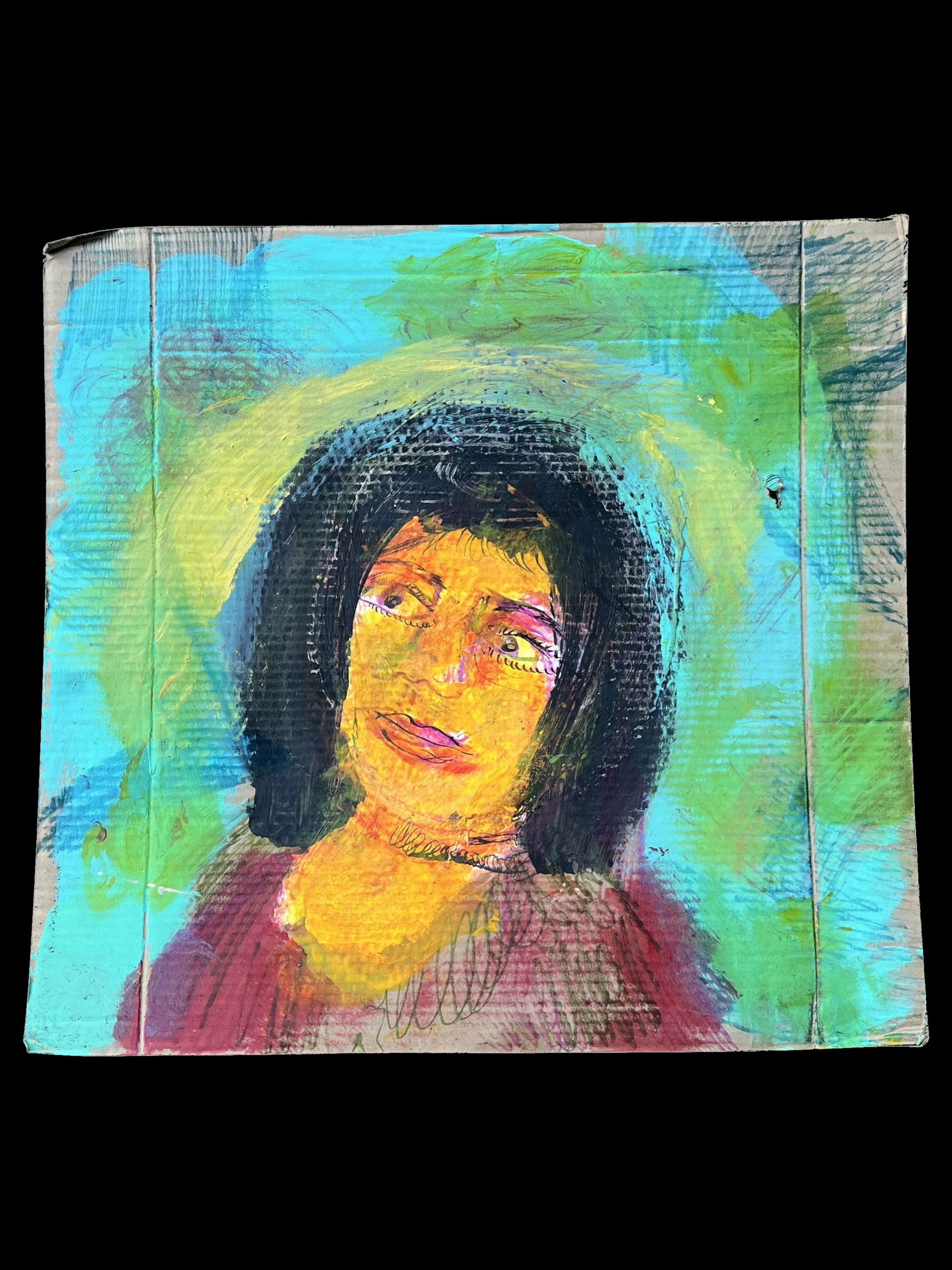 Bathed in a radiant glow, this mixed-media portrait combines acrylic paint and magic marker on cardboard to create an atmosphere of quiet introspection. The subject’s tilted expression is imbued with a subtle melancholy, softened by the vibrant interplay of bright yellows, greens, and blues that surround them like an aura of light. The textured cardboard surface adds depth to the flowing lines and layered strokes, evoking both warmth and fragility. This evocative piece captures the delicate balance between serenity and longing, inviting viewers to pause and reflect.