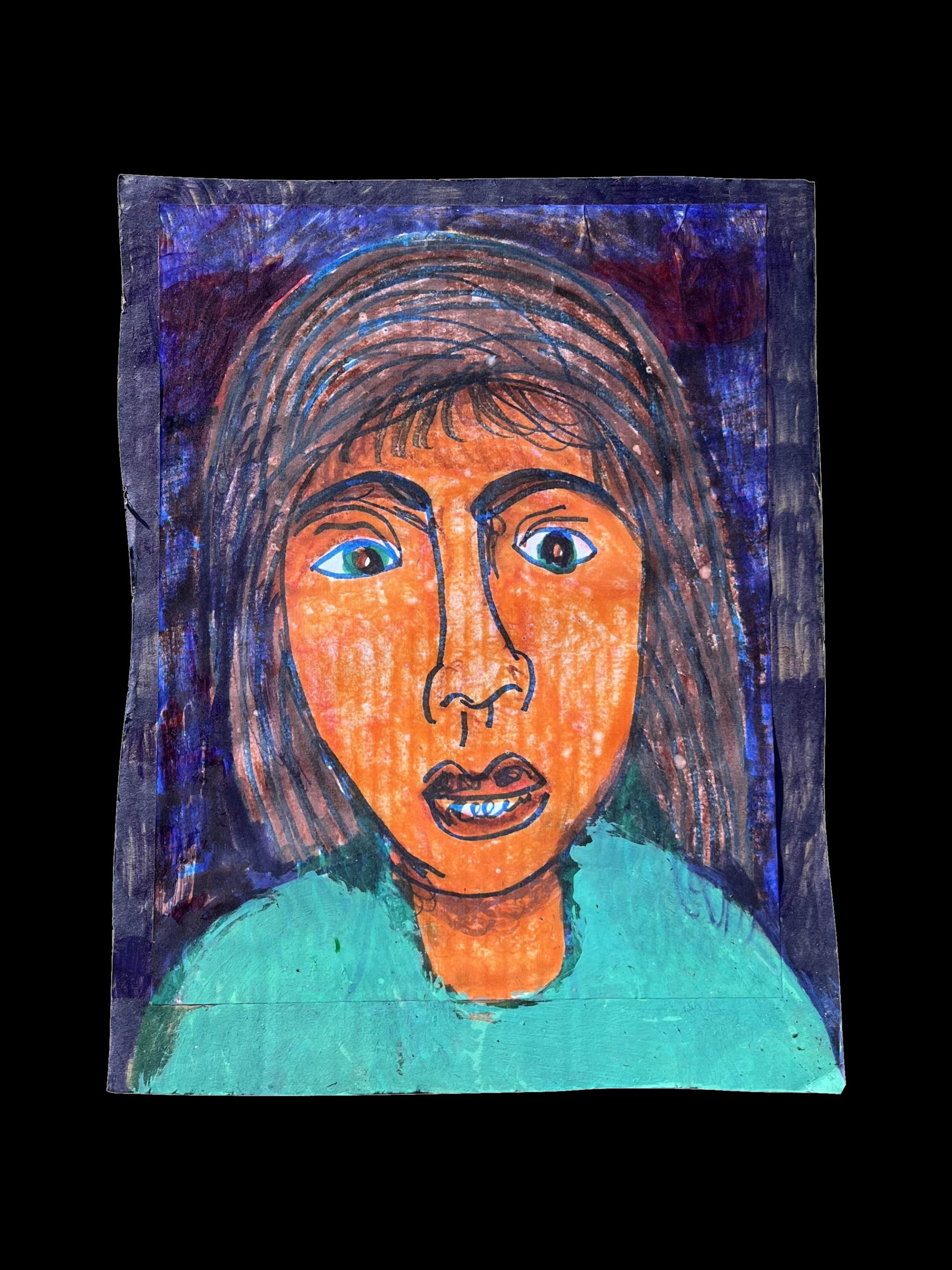 This bold magic marker portrait on textured cardboard captures a moment suspended in thought, where intensity and vulnerability collide. The stark orange of the subject’s face glows against a deep, cosmic blue background, creating a striking interplay between warmth and shadow. Sharp lines and textured strokes hint at unspoken emotions, leaving the viewer to ponder the story behind the wide, searching eyes and parted lips. Crafted by Bobby, this artwork invites interpretation, offering a glimpse into a world of quiet tension and infinite depth.