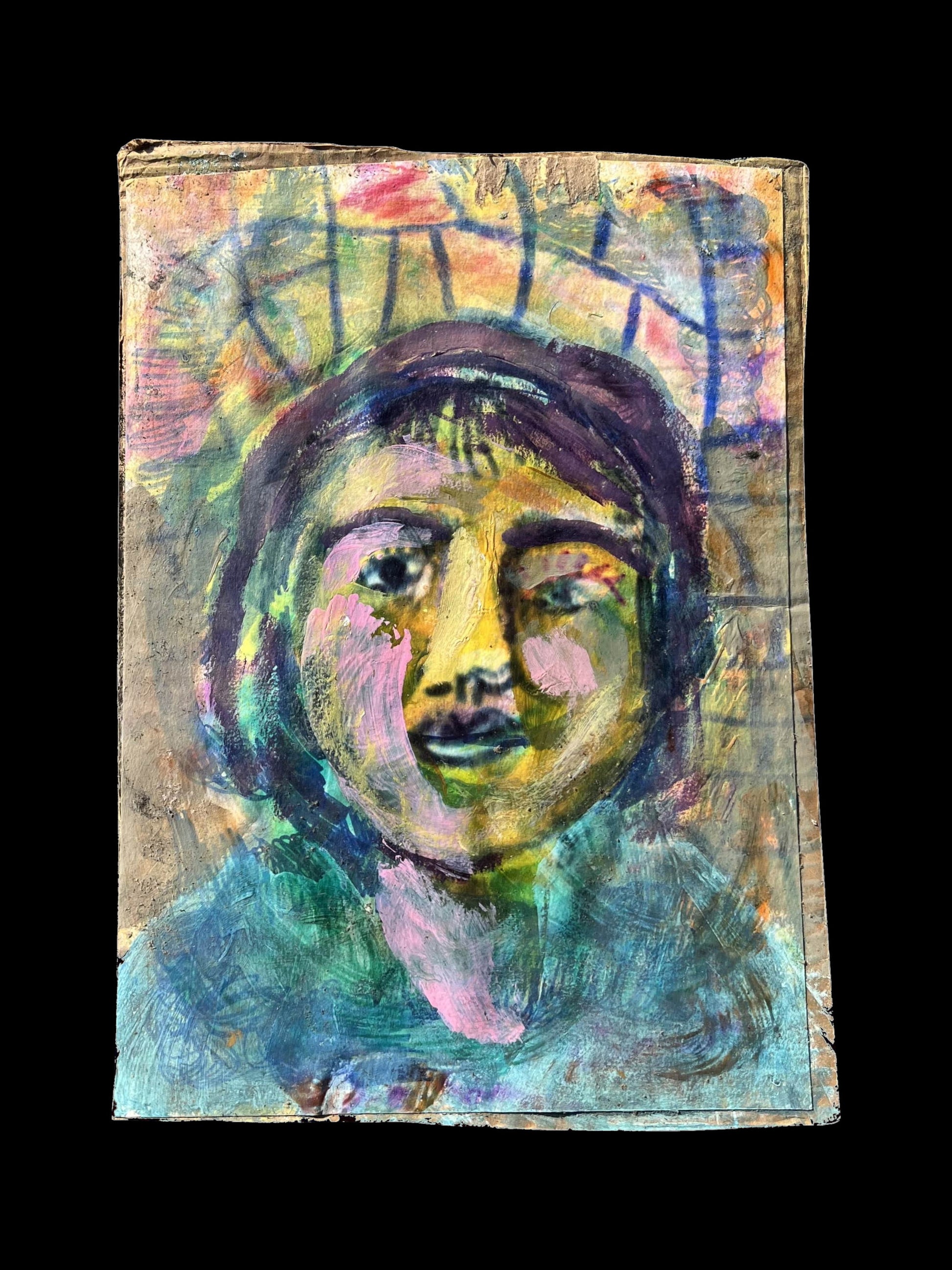 This luminous acrylic portrait on weathered cardboard glows with an ethereal energy. Layers of vibrant greens, yellows, and purples blend into an expressive face that seems to emerge from the cosmos. Delicate streaks of light and soft brushstrokes evoke a sense of inner peace and resilience, while the textured cardboard adds depth and a touch of rawness. Bobby’s mastery of color and emotion transforms the subject into a radiant figure, inviting the viewer to explore themes of renewal, connection, and the beauty found within imperfection.