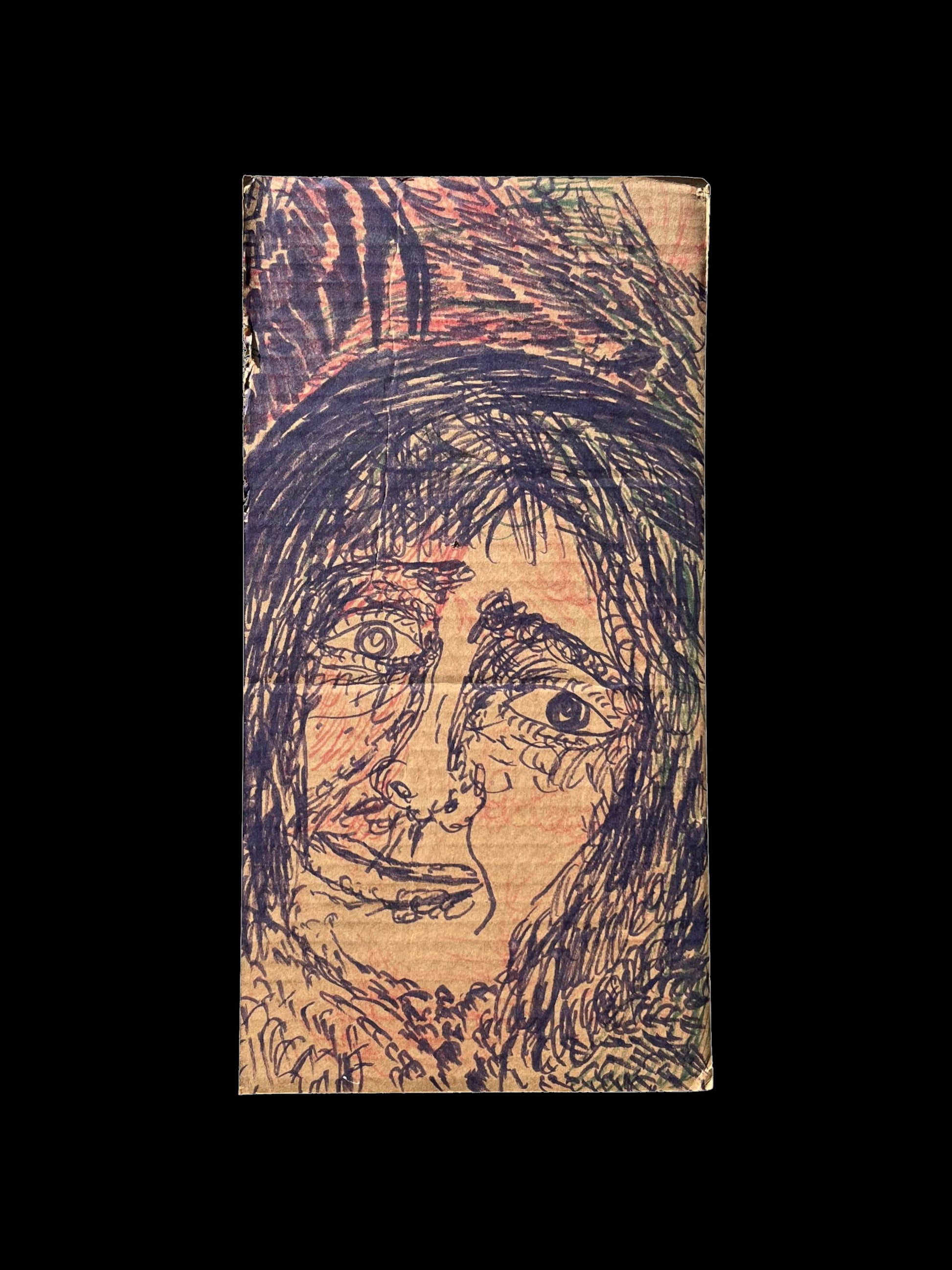 This intricate portrait, drawn with magic markers on textured cardboard, captures the complexity of human emotion through a web of flowing, layered lines. The subject's gaze is striking, almost searching, as if caught in the midst of an untold story. Bobby's use of dense, overlapping strokes creates a tapestry of movement and depth, blurring the boundaries between subject and surroundings. The earthy tones of the cardboard contrast with the bold ink, grounding the piece while enhancing its raw, expressive quality. This artwork invites viewers to get lost in its layers, discovering something new with each glance.