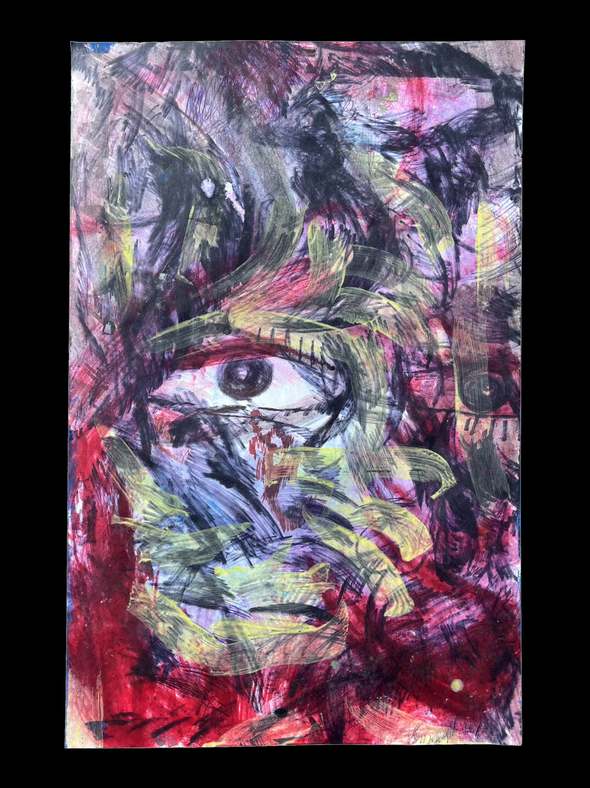 - Front Side: A vibrant and chaotic abstraction centers on a single, intense eye. Layers of bold reds, purples, and yellows swirl together in frenetic brushstrokes, evoking themes of surveillance, emotion, and an unrelenting gaze. The textures and movements create a sense of turbulence and raw energy.