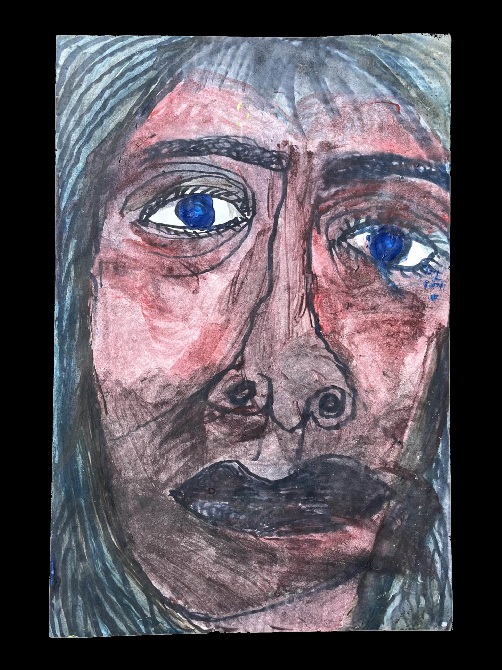 - Back Side: In stark contrast, the reverse offers a striking, raw portrait that draws the viewer into a deeply human moment. The subject's haunting gaze is defined by bold black lines and muted tones of pink and red, reflecting vulnerability and introspection. The interplay of sharp outlines and soft shading underscores the emotional depth of the piece.